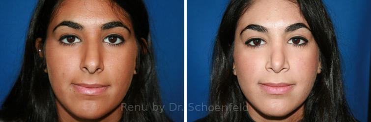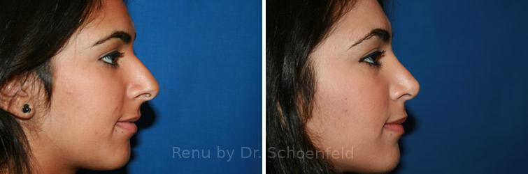Prominent nose treated with retrodisplacement followed by reduction of columella show, upward tip rotation, and dorsal nasal hump reduction.
