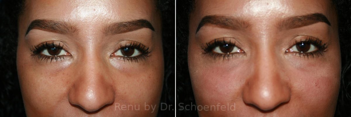 Under eye filler immediately following procedure in 32 year old female with 1cc of Restylane injected with 27 guage cannula. Minimal bruising and swelling.