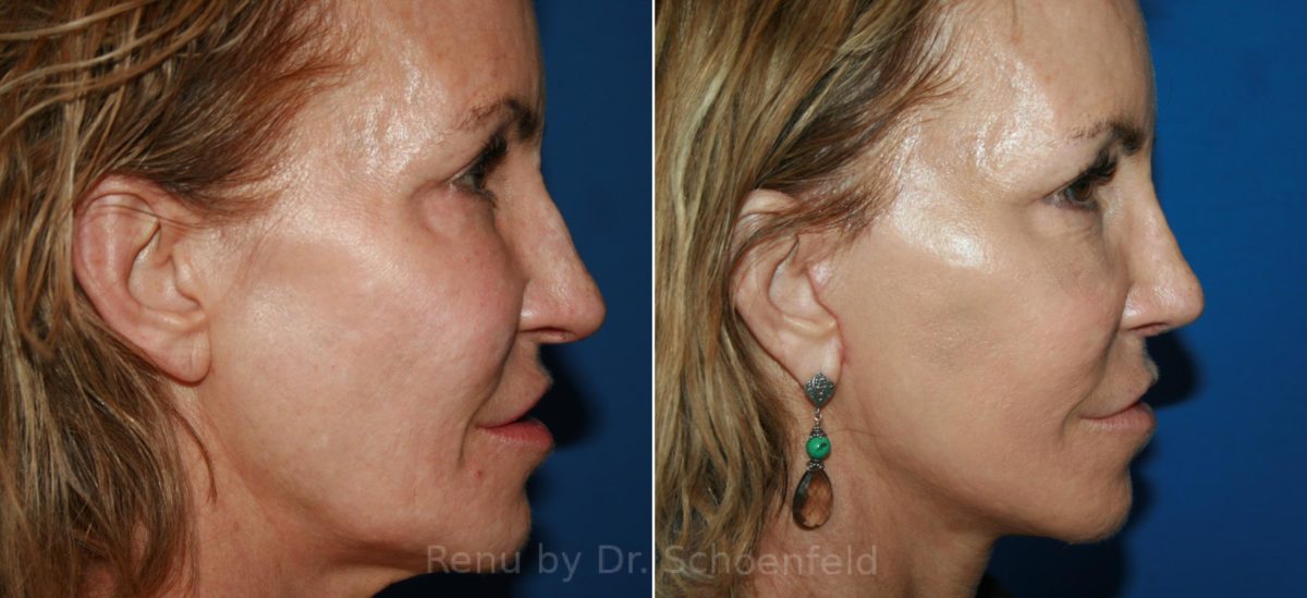 60 year old female patient who has had concerns with sagging of her cheek, jowling, and neckline. She underwent a short flap deep plane facelift to address her concerns. She also had a rhinoplasty which was quite challenging due to the significant nasal skin irregularities from prior acne scarring.