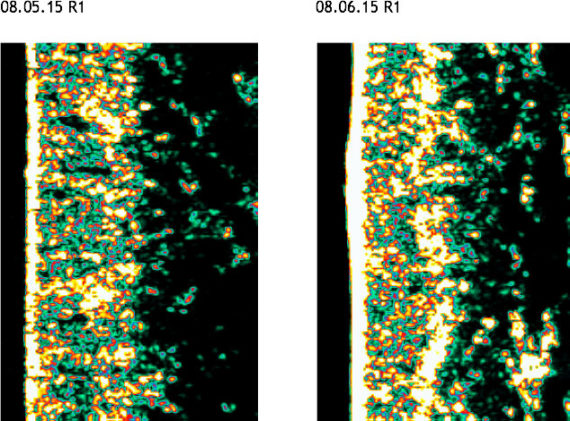 You can see in the image that her skin appears thicker and the collagen structure (the yellow areas) look denser than before the trial (before is on the left, after is the right).