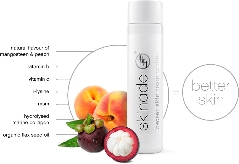 Skinade is a multi-award winning, natural peach and mangosteen flavored anti-ageing collagen drink containing a patent pending formulation of active ingredients that boosts your body’s natural production of collagen and hyaluronic acid. Skinade improves the way your skin looks and feels in as little as 30 days. Skinade has been developed by leading UK scientists and is designed to provide a perfect ratio of liquid to active ingredients to create one of the most advanced, effective and bio-available anti-ageing skincare products on the market today. Skinade is an alternative approach to your skincare regime – a drink that works from the inside out.